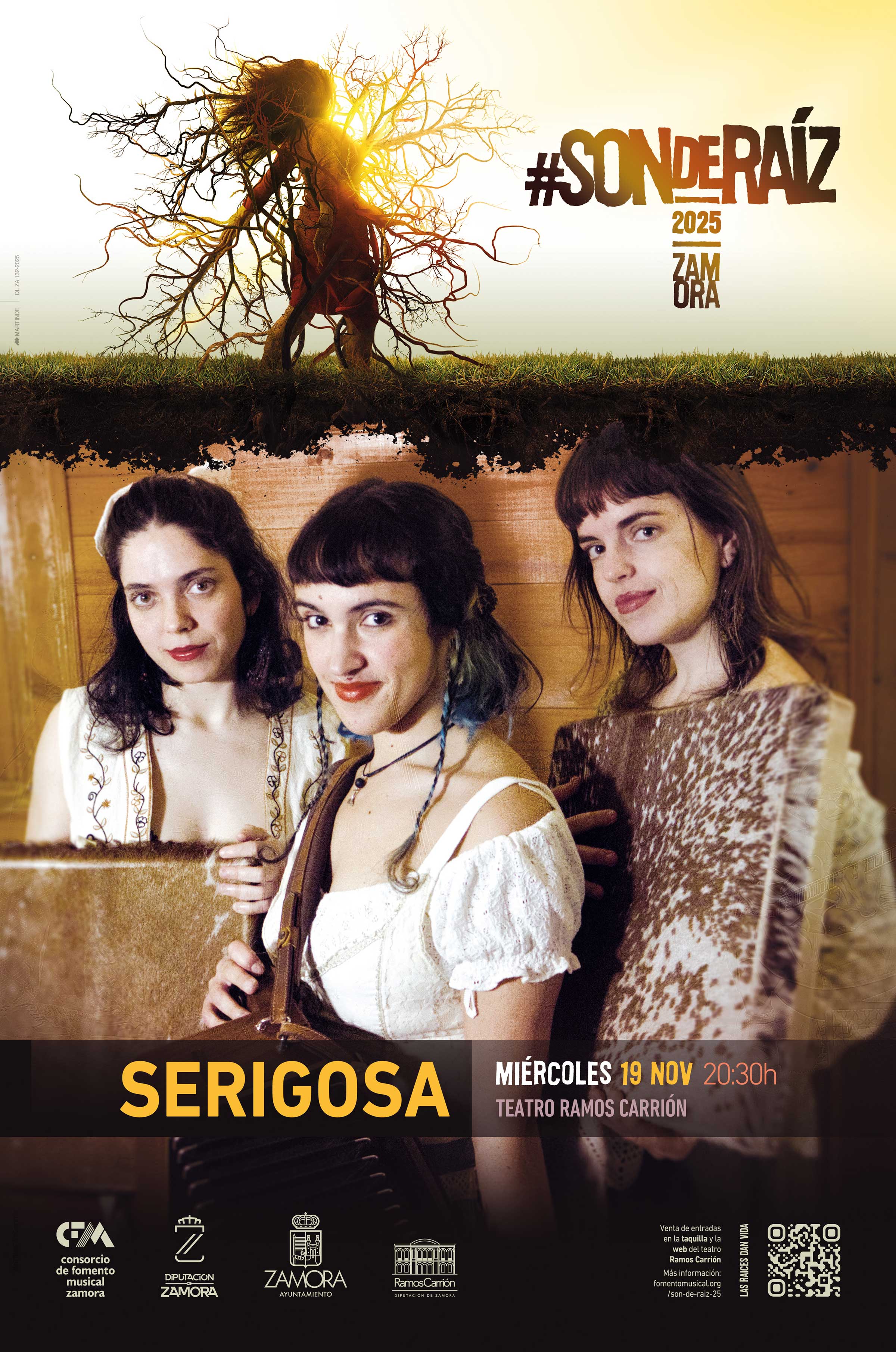 Serigosa, tres voces femeninas, ibéricas, acústicas y bravas como parte del Festival Son de Raíz 2025. Una fusión de tradición y actualidad con voces e instrumentos tejiendo la esencia de los cantos tradicionales de España y Portugal. Miércoles 19 de noviembre de 2025.